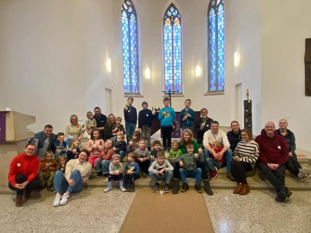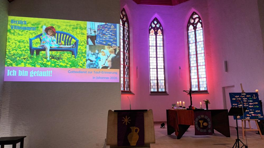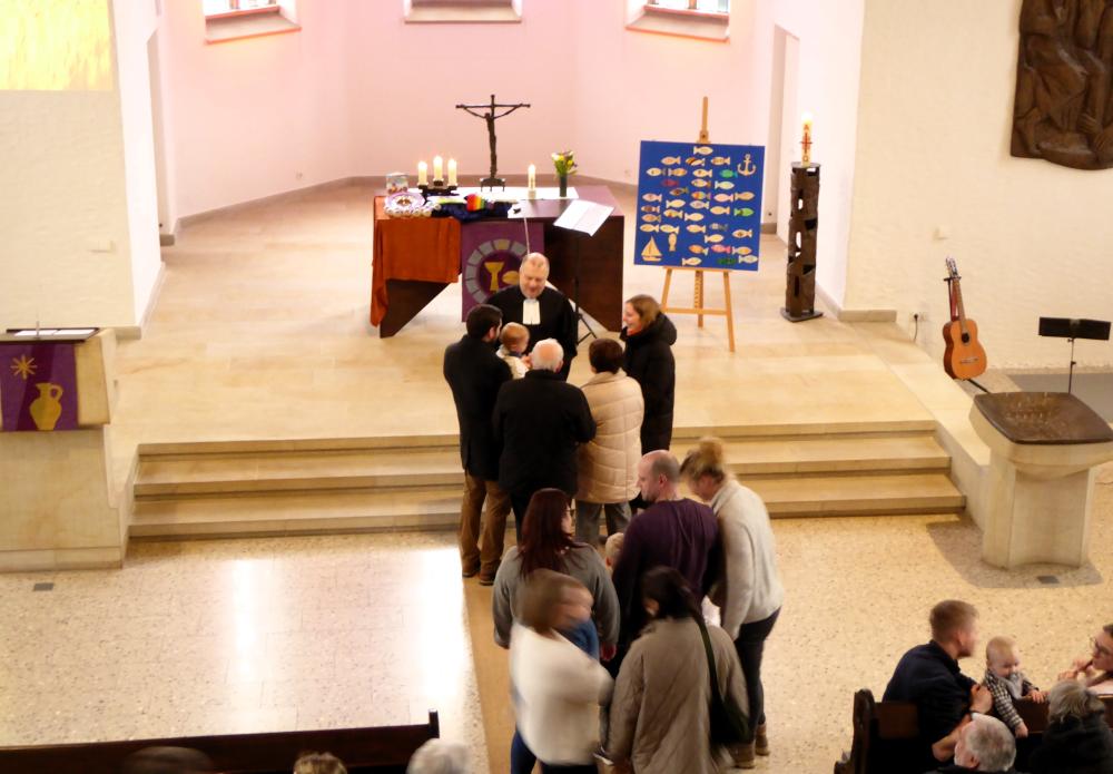 Am vorletzten Samstag im Februar feierten wir wieder einen Gottesdienst zur Tauferinnerung. Viele Familien waren mit den im Jahr 2025 getauften Kindern in die besonders geschmückte und beleuchtete Johanneskirche (Foto oben) gekommen, auch um die Kinder noch einmal bewusst segnen zu lassen. Die gut 60 Teilnehmer sangen Kinder- und Segenslieder, lernten manche Bewegung zu den Liedern und hörten auch Vortragslieder von Birgit und Julius Schinkel (Klavier, Gitarre, Gesang). Eine Mutter und eine Patin lasen Texte zur Taufe und aus der Bibel vor und gestalteten die Fürbitten mit. Pfr. Dirk Schinkel führte durch den Gottesdienst, hielt einen kurzen Impuls zur Bedeutung der Taufe und über die Gemeinschaft in einer Gemeinde und segnete anschließend die Kinder und Familien (Foto unten). Die Tauffische "schwammen" dann wieder in die Familien, und jedes Kind bekam ein kleines Geschenk mit Bezug zur Arche Noah.