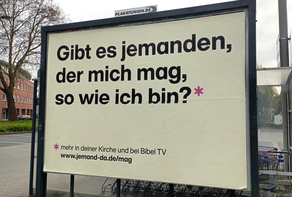 In diesem Frühjahr findet man an Straßen, Kreuzungen oder - wie hier - auf Parkplätzen beim Supermarkt Plakate mit anderen Botschaften als man sie sonst sieht. Der Fernsehsender Bibel TV hat eine Aktion gestartet, um Menschen auf Gott, Glaubensthemen und Kirche aufmerksam zu machen. Die aus Spenden finanzierte Plakatkampagne möchte Menschen dazu einladen, wieder oder erstmals eine Kirche oder eine Gemeinde vor Ort zu besuchen. Sie möchte eine öffentliche Aufmerksamkeit für die Frage nach Gott schaffen. Gott soll wieder Gesprächsstoff sein – in Kirchen und Gemeinden, christlichen Werken, aber auch im persönlichen Gespräch zwischen Menschen im Alltag – über alle Konfessionen hinweg. Matthias Brender, der Leiter von Bibel TV, sagt: „Herzliche Einladung an alle Christen und Gemeinden, diese von Tausenden Unterstützerinnen und Unterstützern finanzierte Kampagne als Anknüpfungspunkt zu nutzen. Auch der Nachbar, der Arbeitskollege oder der Freund im Sportverein werden diese Plakate sehen - das macht es einfach, über Gott ins Gespräch zu kommen.“ [Text nach bibeltv.de] Wir finden: Eine gelungene Aktion und ein guter Anlass, z.B. einen Gottesdienst in der Johanneskirche zu besuchen und etwas über Gott und Jesus zu erfahren. Herzliche Einladung! Ein passendes Lied zum obigen Plakat übrigens findet man unter diesem Link :